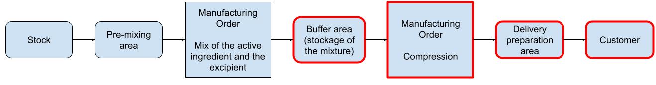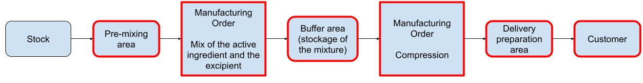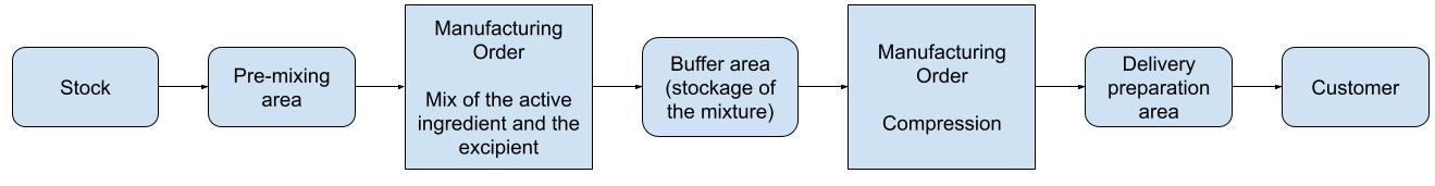 Let's imagine a company that produces a medication in two steps: first, mixing an excipient with an active ingredient, then compressing the mixture to produce tablets. This medication, costly to produce, is manufactured only upon order. Delivery is completed in a single step.