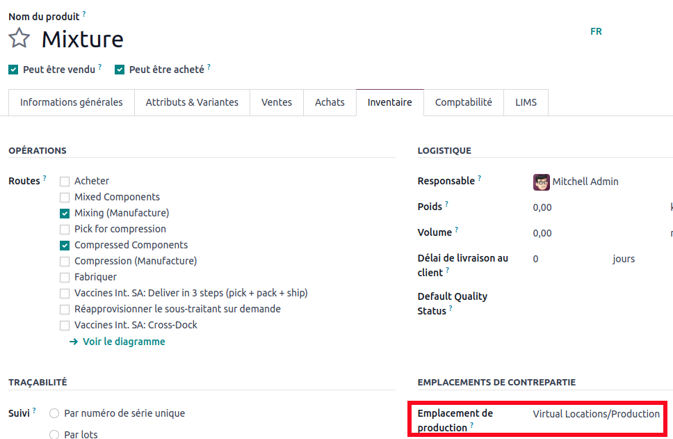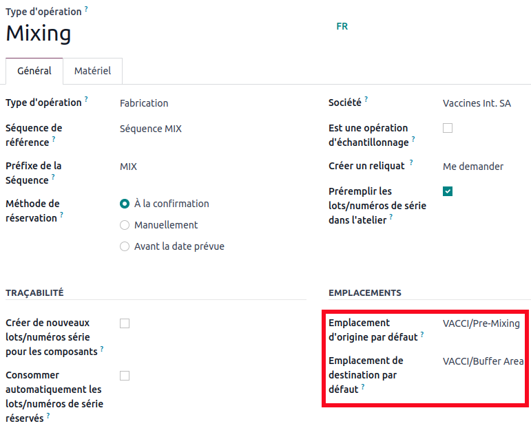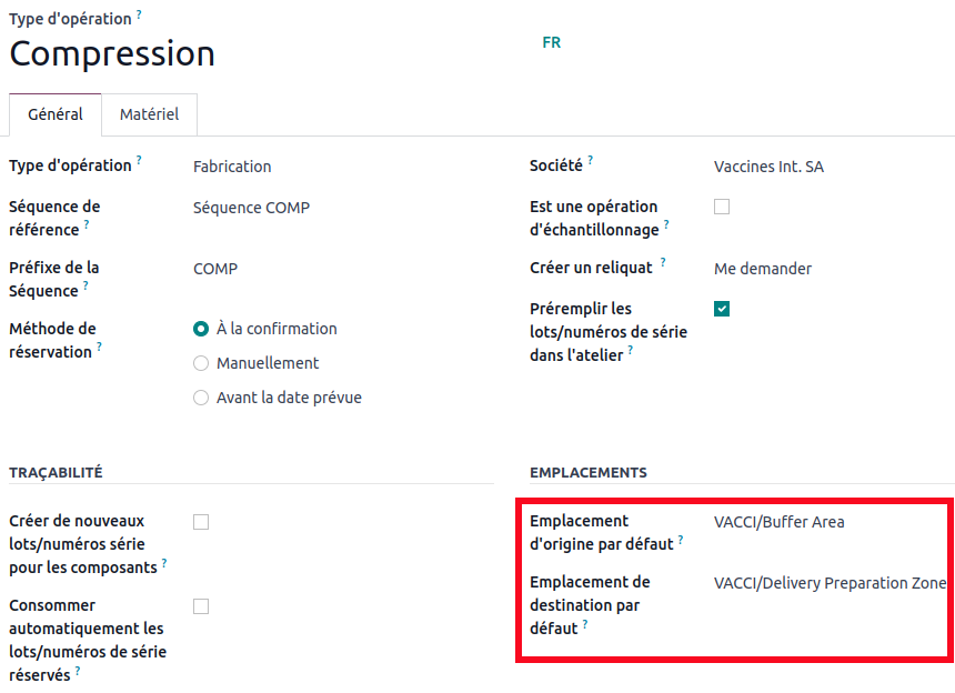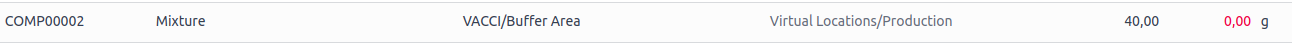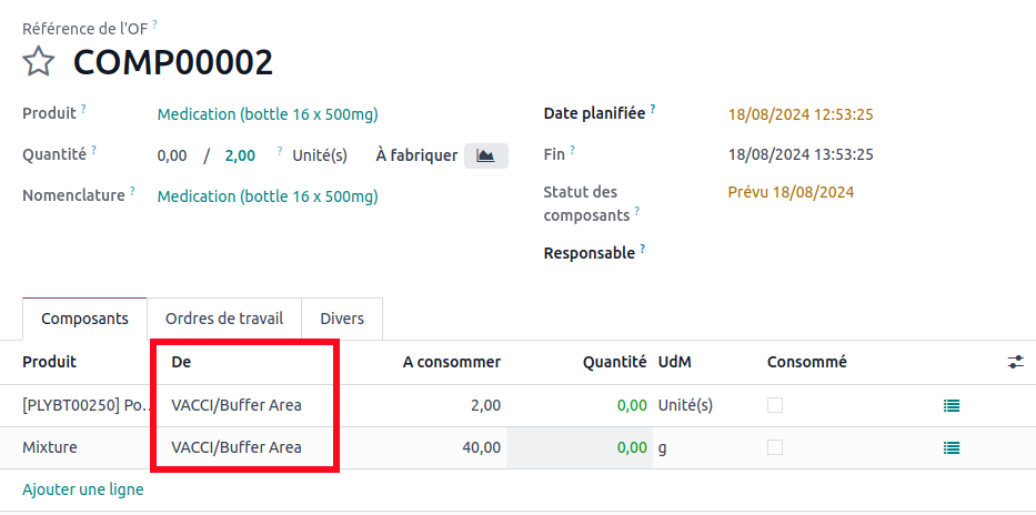 Thanks to the configuration we made in the bill of materials, you can see that the compression manufacturing order correctly retrieves the components from the 'Buffer Area' location.