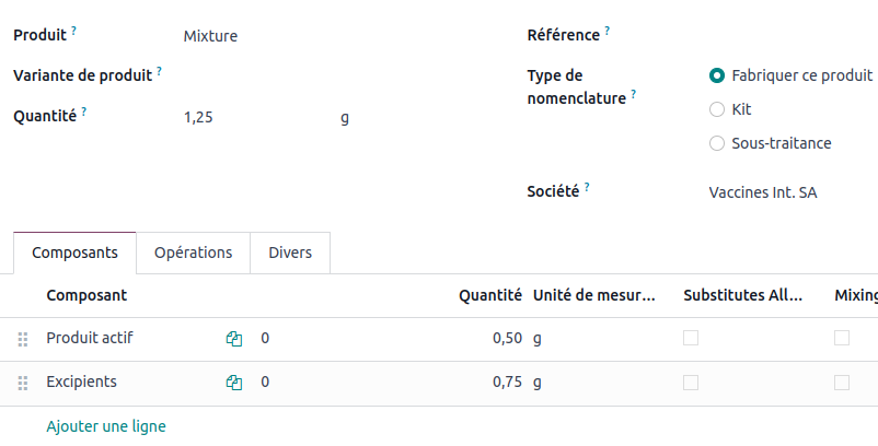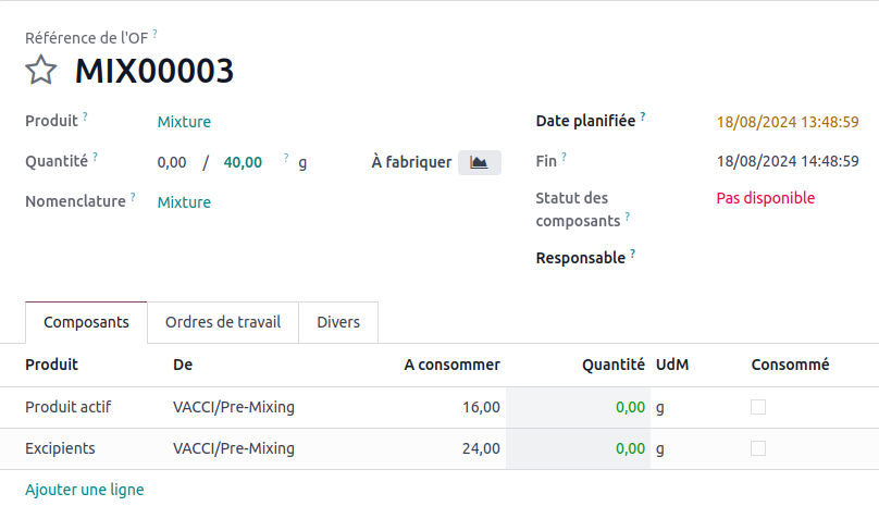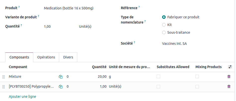 Upon confirmation of the quotation, Odoo will then generate two manufacturing orders: one for the bottle of medication and another for the mixture.
