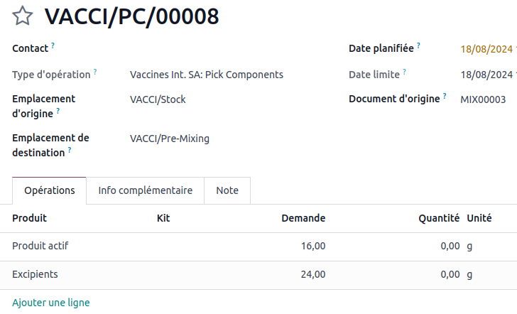Upon validating the quotation, a logistics transfer request is also generated and linked to the manufacturing order for the mixture.