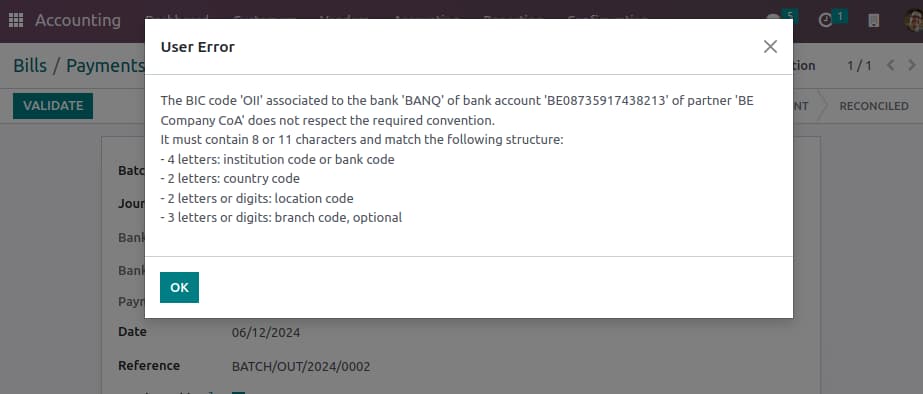 Many customers experience quality issues in their data. This comes from human errors or oversights, or even hasty typing. The new version will allow SEPA files to be validated in Odoo before sending to Isabel. This will have the advantage of noticing the error before the file exchange, which will simplify the flow and speed up data correction.