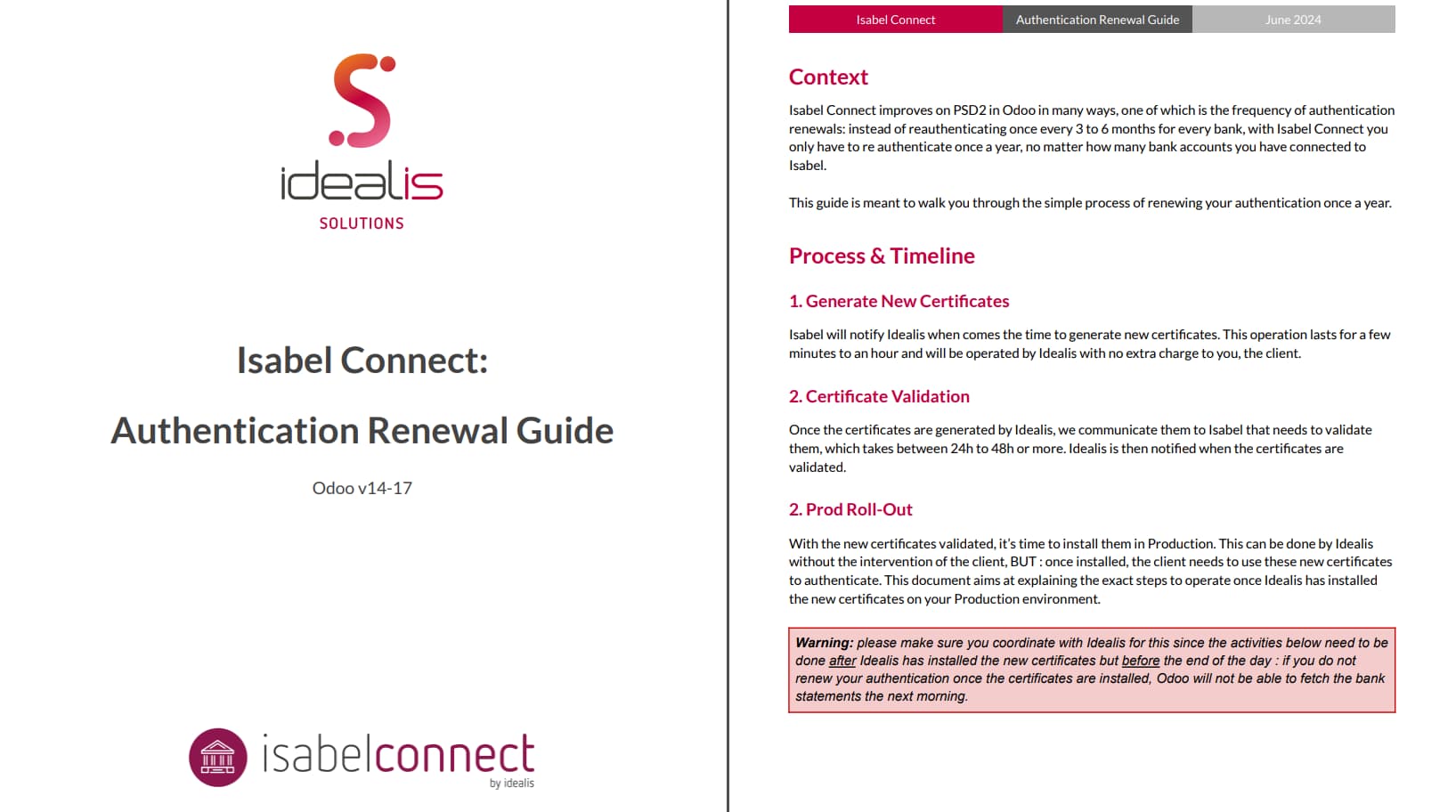 Unlike what Odoo requires off the shelf with the PSD2 standard, with Isabel Connect it is not necessary to reconnect to your banks every 3 to 6 months. On the contrary, our solution allows us to only ask our customers to re-authenticate to Isabel once a year. That is once every twelve months for all connected bank accounts.