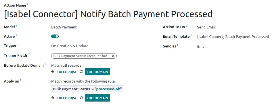Very often, the person preparing the payments is a different person than the one signing them for execution. Today, when a payment is sent to Isabel, the person who prepared it must notify the signatory manually. This generally happens via an email (with a PDF printout of the payment attached) or a “tag” in Odoo which triggers a notification. This last action for the person preparing the file will therefore no longer be necessary since Isabel Connect will automatically send the notification to the person concerned.