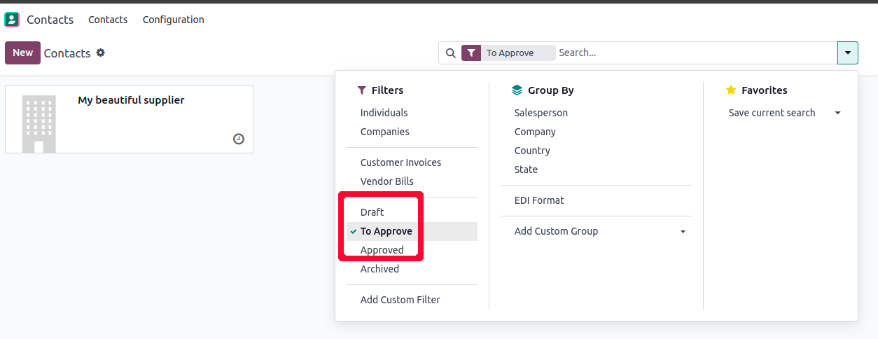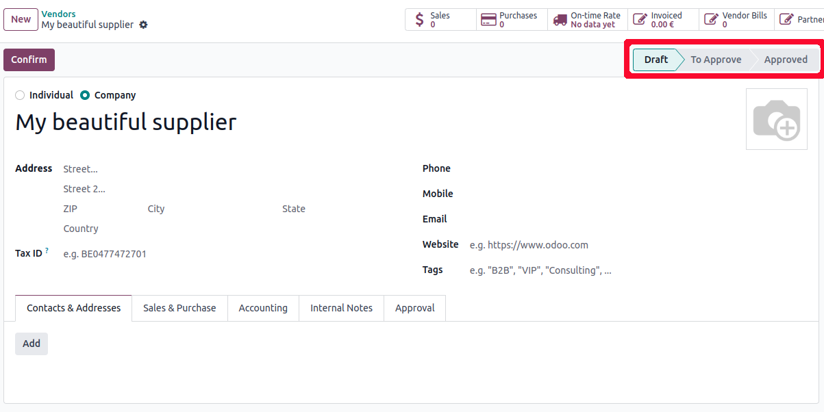 - Within the supplier view, two buttons allow any user to transition the supplier to the 'To Approve' state.
