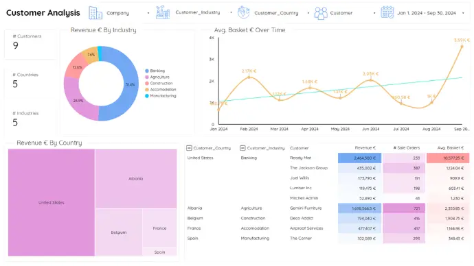 Drive your business with relevant reports, using the advanced features of a BI tool (e.g. Looker Studio or Power BI), directly integrated into your Odoo ERP.
